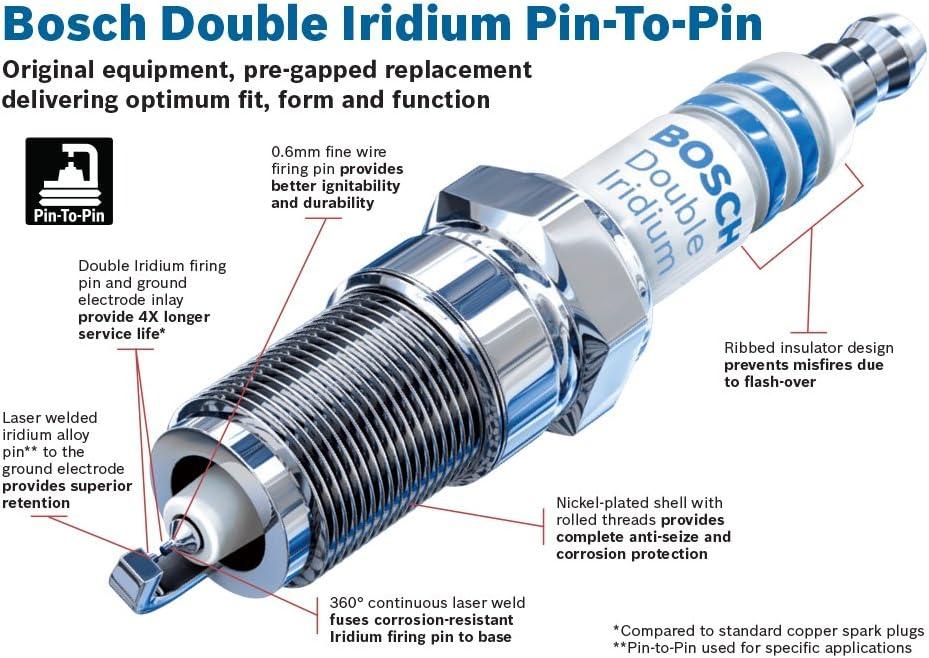 Bosch Double Iridium Pin-to-Pin technology features 2 iridium-alloy electrodes – an iridium-alloy firing pin and iridium-alloy pin laser-welded onto the ground electrode, delivering higher performance through more efficient flame-kernel growth